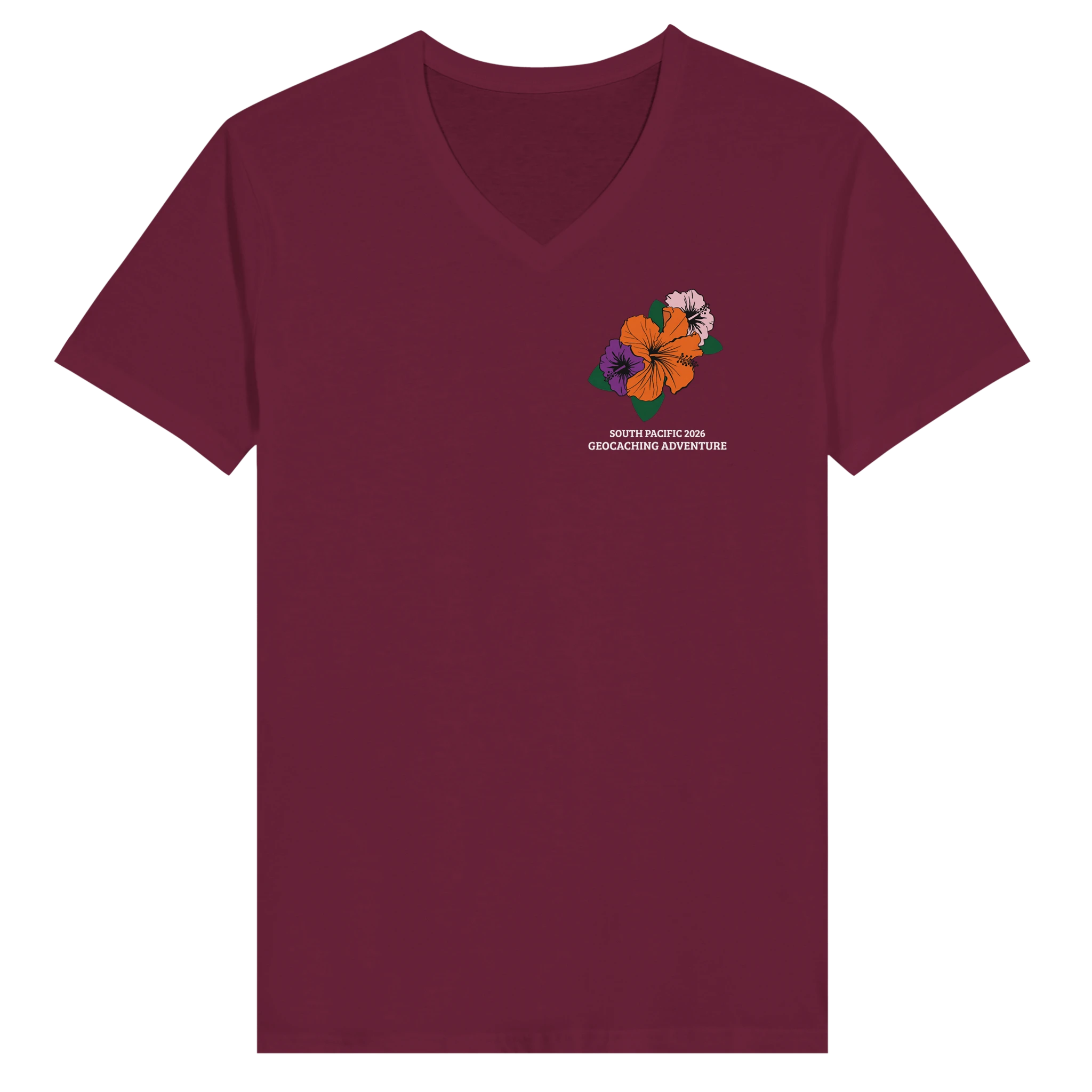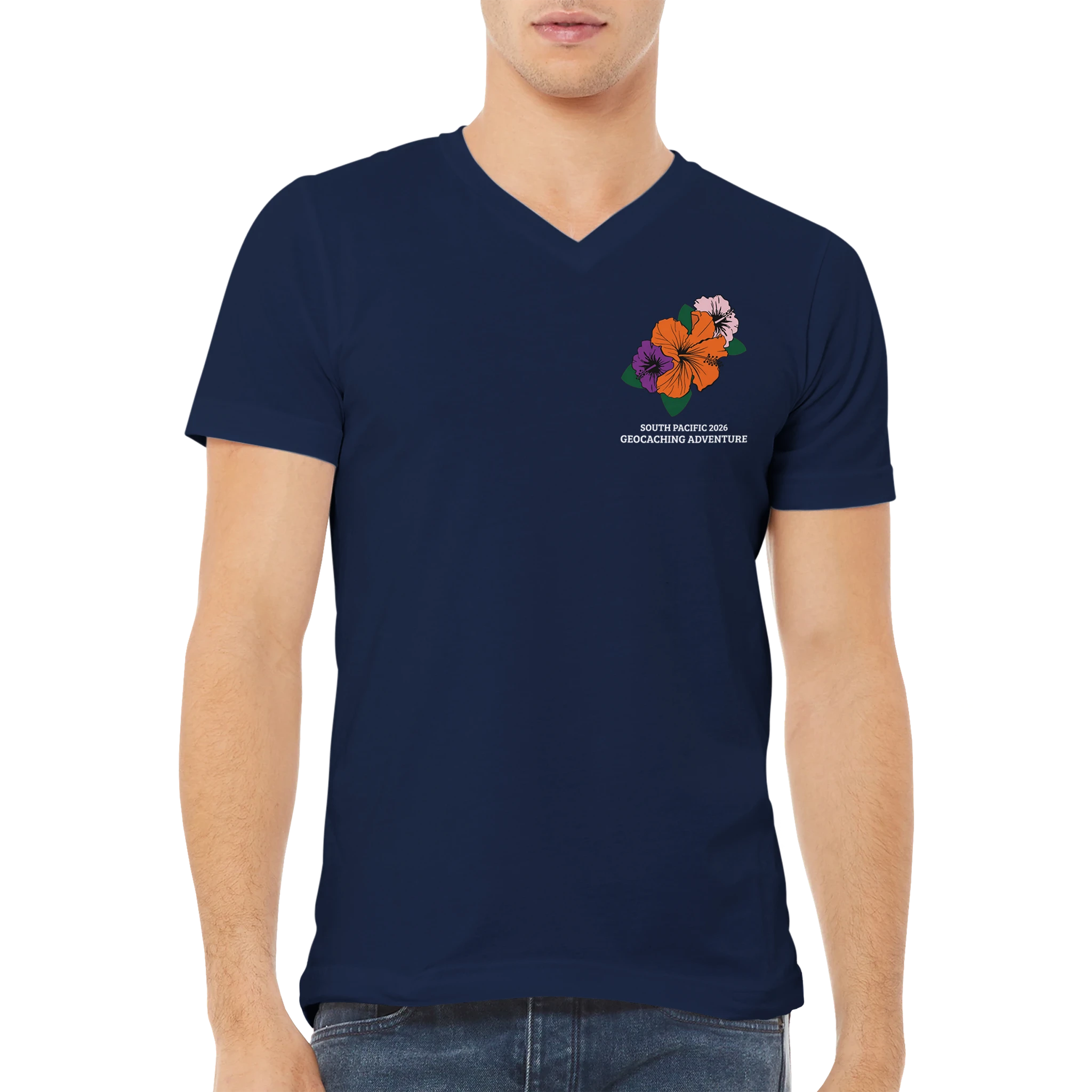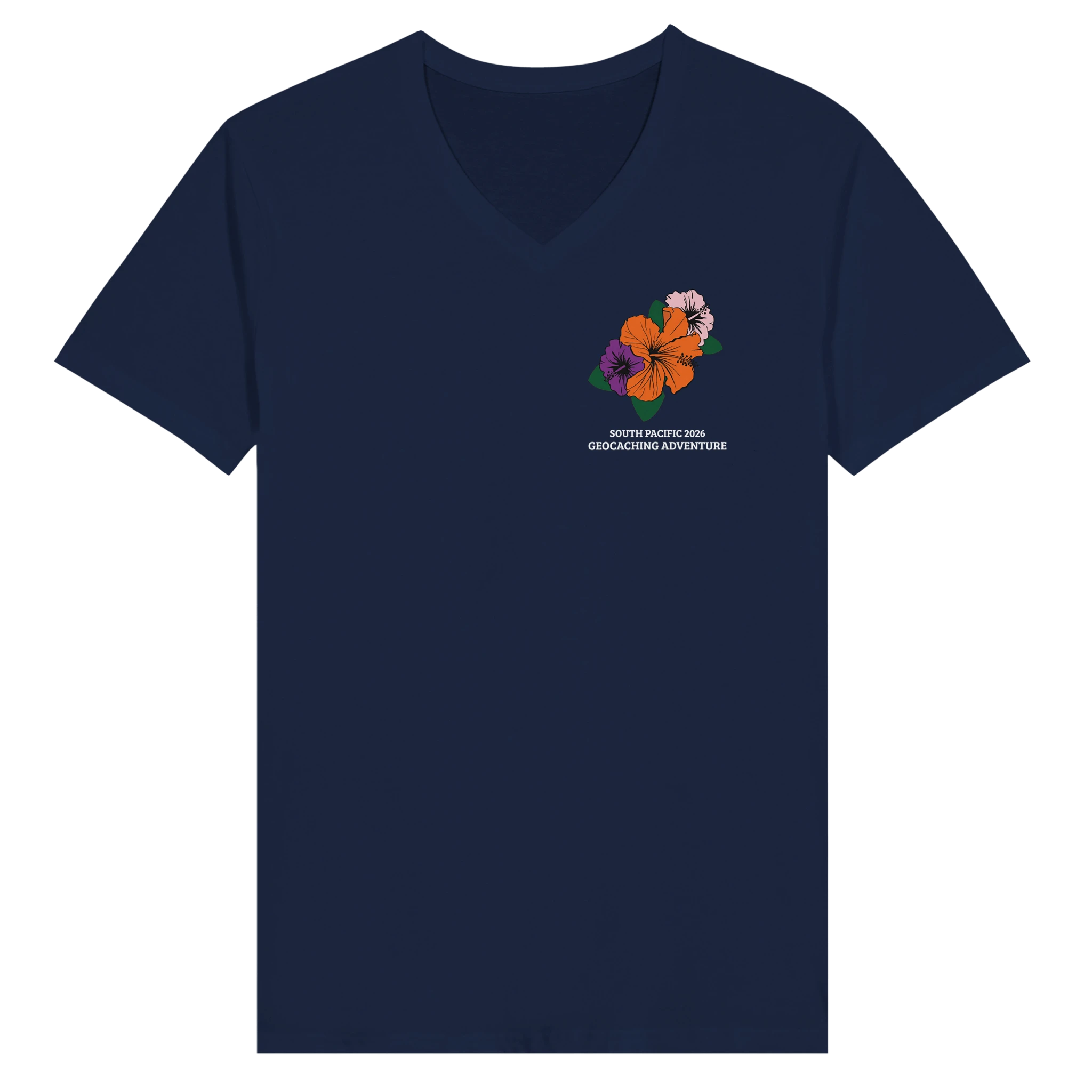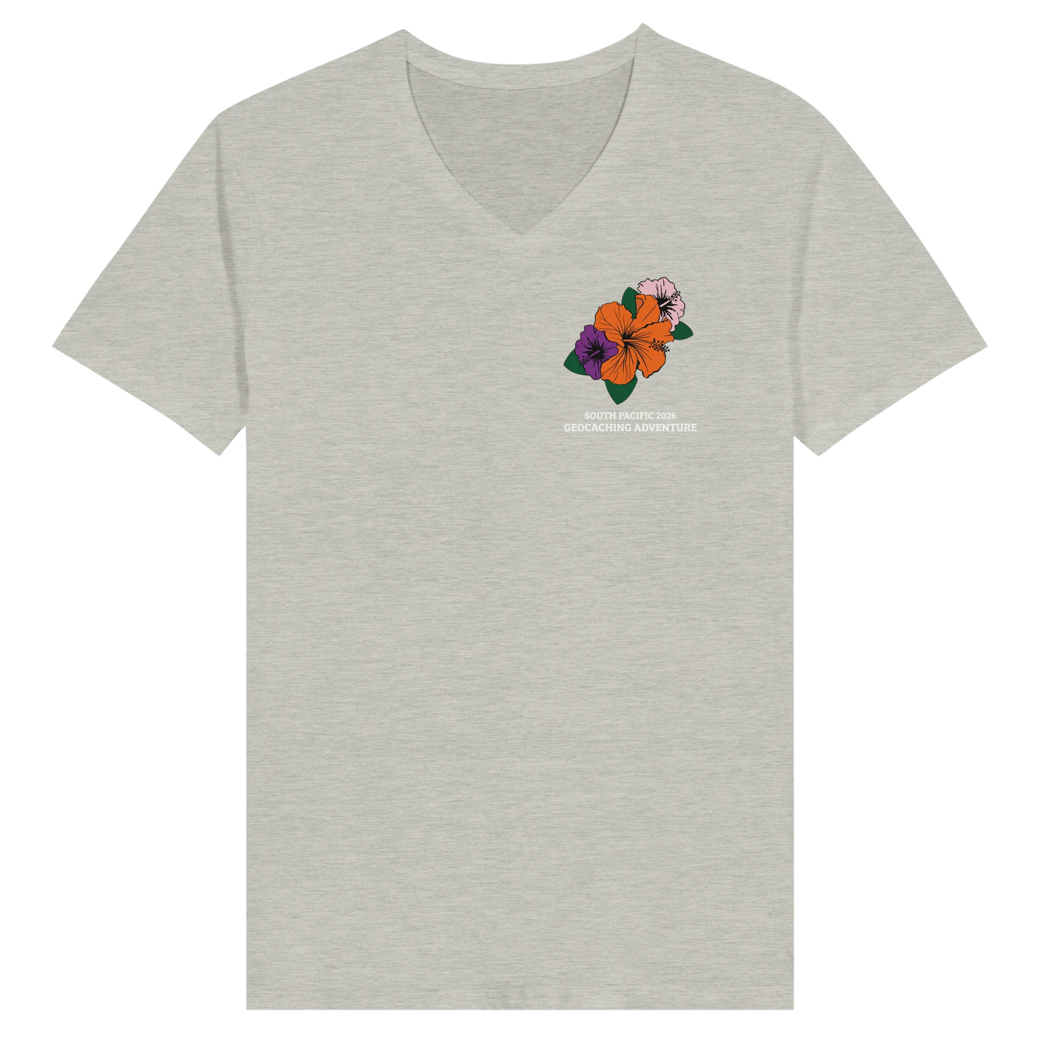 Choose this classic unisex V-neck shirt to commemorate your geocaching adventure to the South Pacific! Brand is Bella+Canvas 3005.